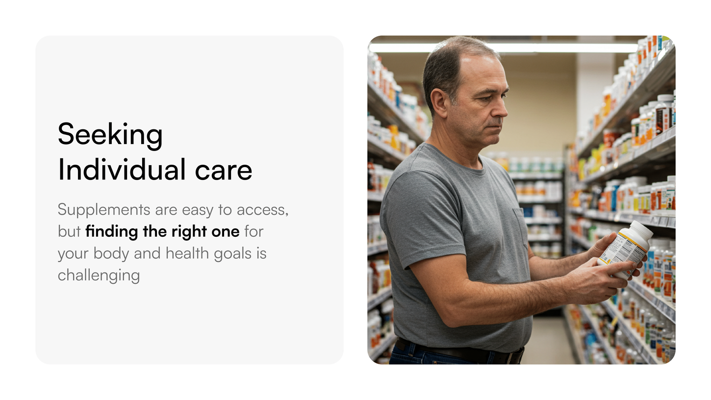 Our team combined expertise in Industrial Design, UI/UX, and Business to tackle a challenge in the personalized health space. Over three months, we audited the wellness market, conducted research with 30+ participants, and explored user needs around nutraceuticals.